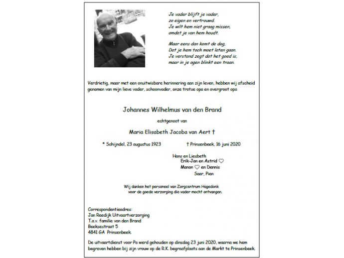 Op dinsdag 16 juni is op 96-jarige leeftijd Johannes Wilhelmus van den Brand overleden. Vandaag was de uitvaartdienst. Hij is begraven op de rooms-katholieke begraafplaats aan de Markt in Prinsenbeek.