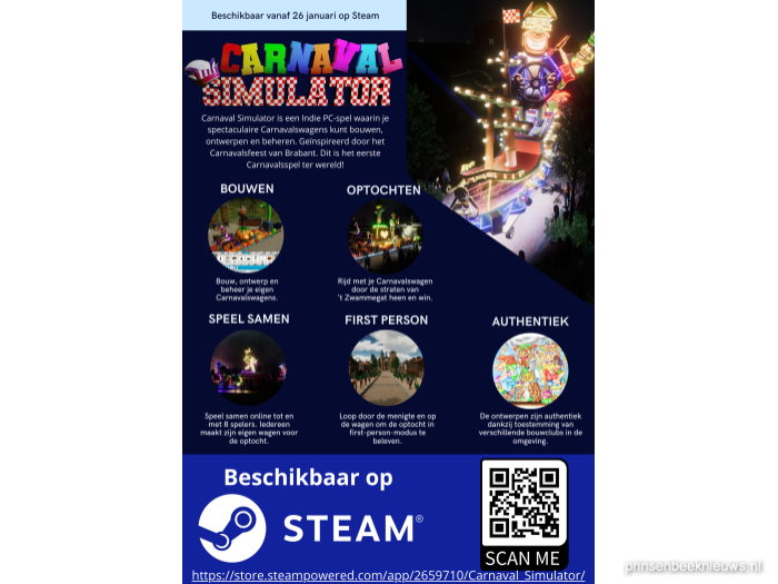 Carnaval Simulator bestaat uit meerdere levels. Zo moet een speler bijvoorbeeld rekening houden met het gewicht en de hoogte van de wagen, het budget en het aantal figuranten, meldt Omroep Brabant. En de wagen wordt beoordeeld. Wanneer je het spel met meerdere mensen online speelt, jureer je elkaar. Anders bepaalt de computer de score. De game is vanaf 26 januari beschikbaar via software-distributieplatform Steam. Voor het artikel van Omroep Brabant: klik hier.