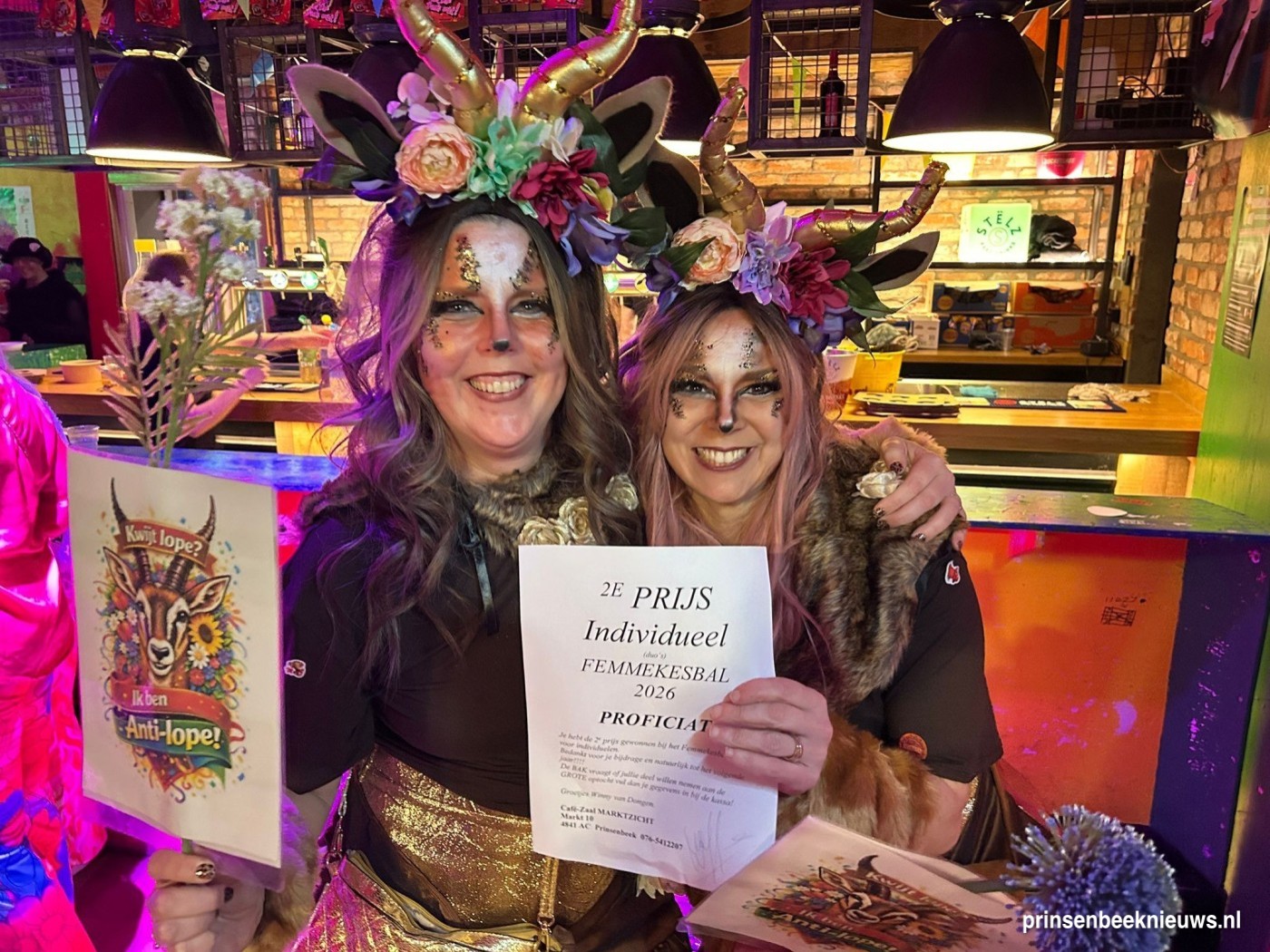 Die mooie creaties waarin iedereen naar het Femmekesbal komt, dingen ook altijd mee naar de prijzen. Veelal zijn ze geïnspireerd op het motto van de BAK, dit jaar: 'Hier lopte nie kwijt'. Bij de groepen was de eerste prijs dit keer voor De Druifkes met ‘Het Wijnproeverijtje’ en de tweede voor CV Doede Mee met ‘Wij laote onze spore na’. Bij de duo’s ging de eerste prijs naar Maartje en Mariëlle met ‘In de bak lopte nie kwijt’. De tweede prijs hier was voor ‘Kwijt lope? Ik ben Anti-Lope’.