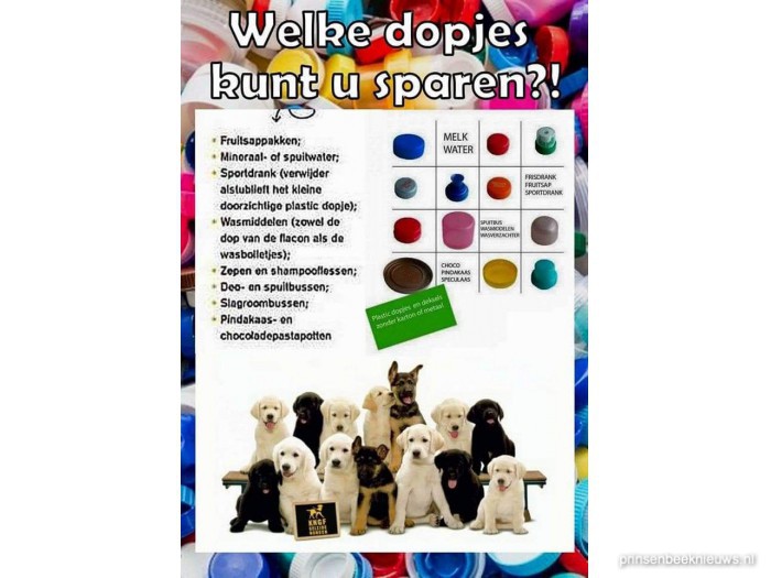 Wat kun je doen? Maak voor jezelf een zakje of een bakje waar je de plastic doppen en kroonkurken (bierdopjes) in bewaart. Let op graag schoon (de plastic dopjes even onder de kraan en afdrogen met de handdoek) aanleveren, zodat ze niet gaan stinken.