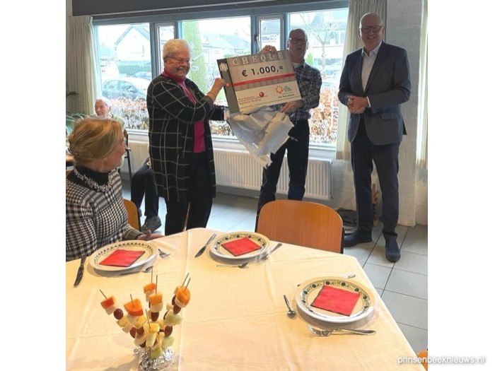 Voordat het smulfestijn kon beginnen, gebeurde er iets onverwachts: de Zonnebloem in ons dorp kreeg een cheque van duizend euro namens de West-Brabantse Kegelbond De Kring. René de Bruijn overhandigde die aan Zonnebloempenningmeester Anton Hoeven. De kegelclub heeft zichzelf namelijk opgeheven en het geld dat nog in kas zat, deelt ze uit aan goede doelen.