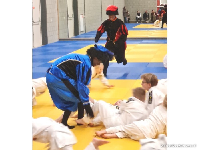 De jongste judoka’s van Kuatsu kregen tijdens de les in De Drie Linden donderdag pietenbezoek. Met een zak vol pepernoten en cadeautjes kwam het duo de dojo binnengestormd.