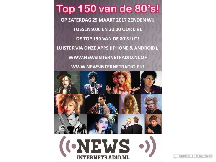 News Internetradio zendt zaterdag 25 maart de door de luisteraars samengestelde lijst ‘Top 150 van de jaren ‘80' uit. Vanaf 9.00 uur tot 20.00 uur zullen de dj's van News de grootste hits uit de 80's live laten horen via de gratis Android- en iPhone-app en via de websites www.newsinternetradio.nl of www.newsinternetradio.eu.
