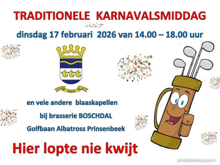 ‘Zin in een ouderwets gezellige Karnavalsmiddag? Komt dan dinsdag 17 februari naar de golfbaan van Albatross aan de Weimersedreef’, luidt de oproep van blaaskapel T.T.T, die de zogenaamde 'TTT-manifeestatie' met carnaval in Brasserie Boschdal organiseert.
