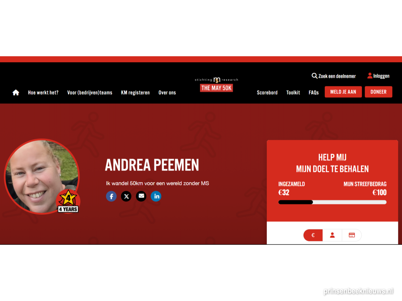 Voor een ander goed doel is Andrea Peemen ook actief. Net als vorig jaar doet ze weer mee aan The May 50K om geld op te halen voor MS onderzoek, omdat ze zelf ook aan de ziekte lijdt. The May 50K is een virtuele fitness- en fondsenwervingsuitdaging om geld in te zamelen voor onderzoek naar multiple sclerose (MS). Ze hoopt dat dorpsgenoten haar inspanningen voor dit doel willen sponsoren. Doneren kan via haar persoonlijke pagina: klik hier. Kijk ook eens op: www.themay50k.nl.